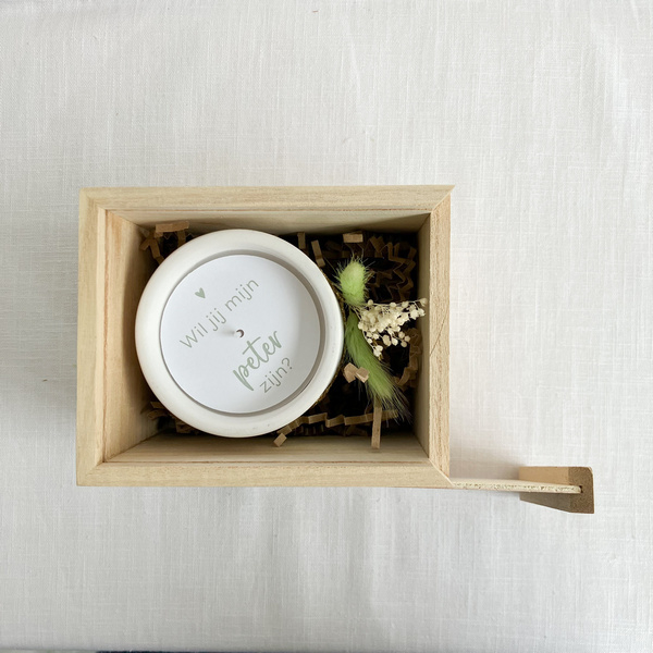 Het potje is afgewerkt met een gouden koordje en een fijn mini droogboeketje, waardoor deze cadeaubox een volledig, kant-en-klaar peter geschenk vormt.