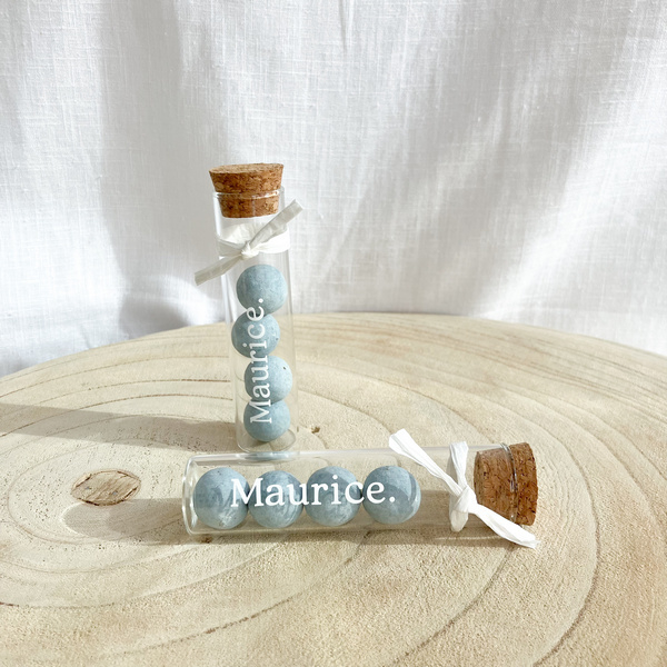 Gevuld met meli melo snoepjes van Joris in blauw-witte tinten, versierd met naamkaartje en jutte touw10 lage proefbuisjes met kurk