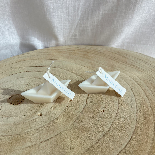 Originele kaarsjes in de vorm van een papieren bootje, met naamkaartje aan de wiek10 frosted glazen flesjes