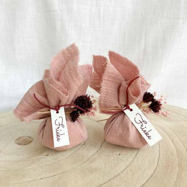 Afgewerkt met donkerrood koord, naamkaartje en mini droogbloemenboeketje5 oudroze tetradoekjes