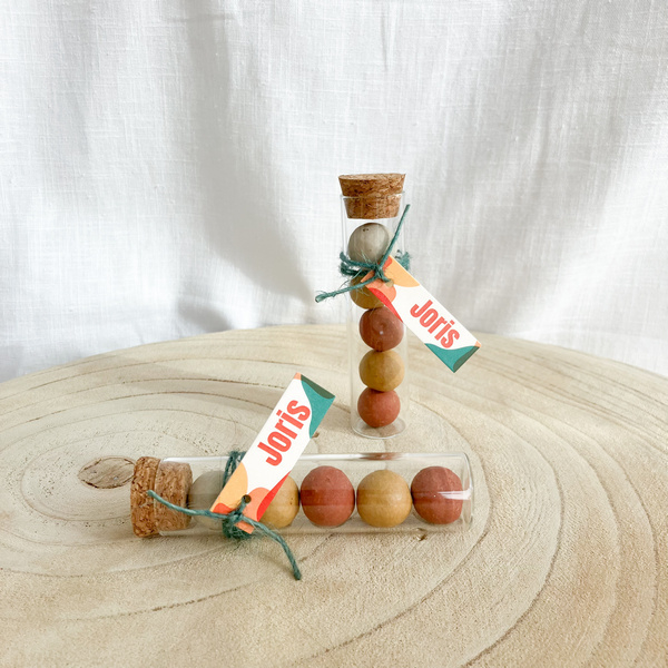 Gevuld met 5 bloemen-zaadbommetjes in rood, oker en ecru